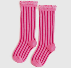 Taffy pink stripe lace top knee high socks